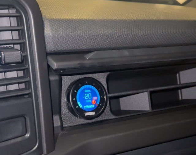 If you are looking for a clean solution to mount guage in your 21+ F150 this is it. This shelf utilizes the upper glovebox cubby and creates a perfect place for you guage. No blocking the AC vent, no pod hanging off your dash- this shelf mount looks factory, Avaiable with or without dividers.